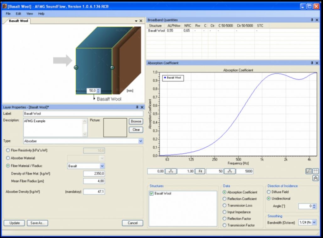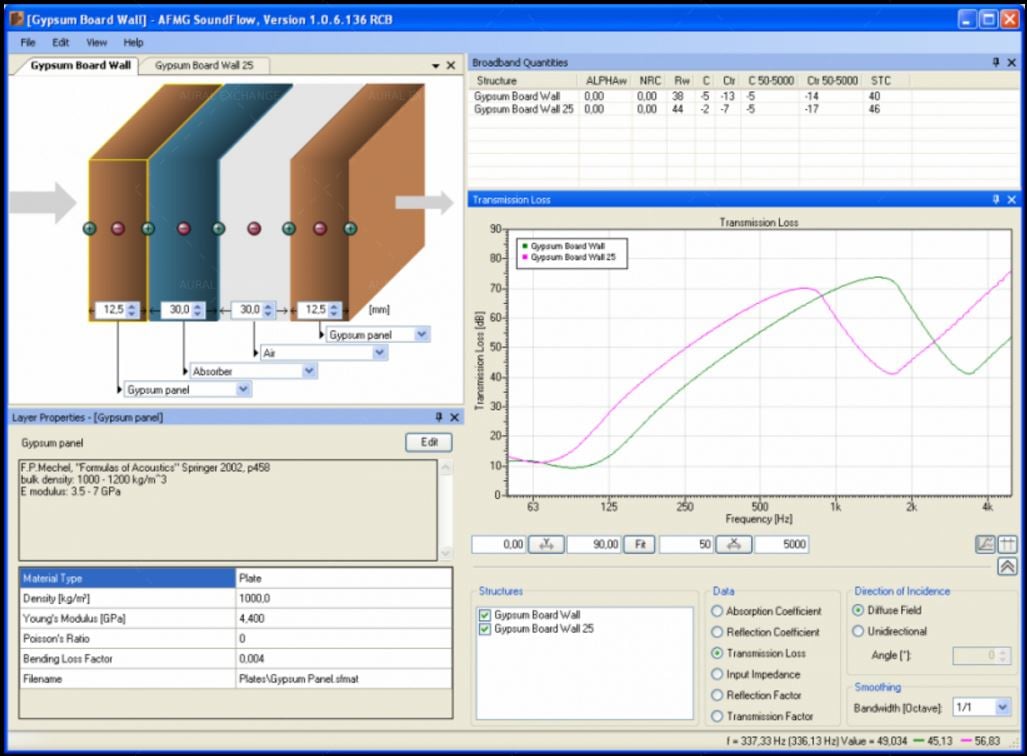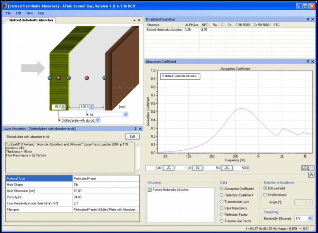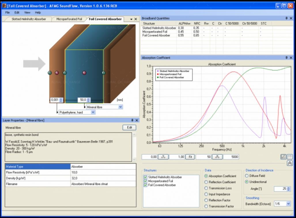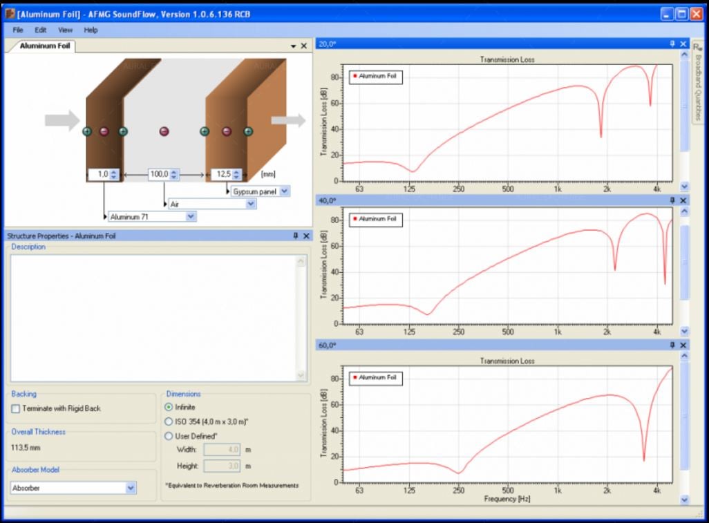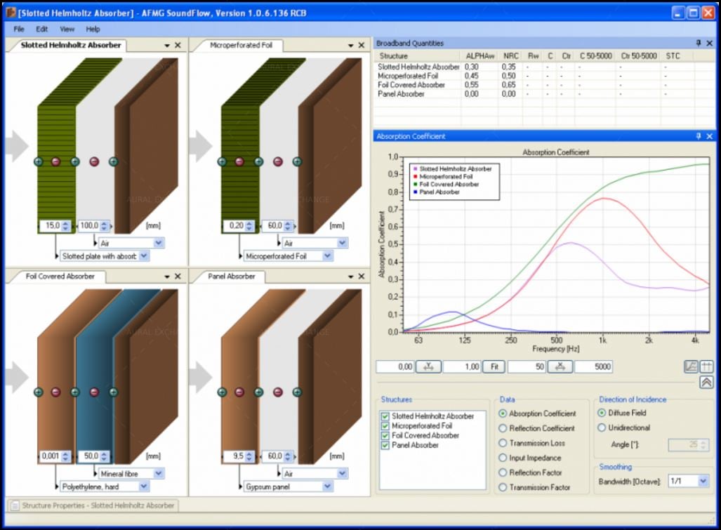 AFMG SoundFlow is a simulation software for calculating the absorption, reflection, and transmission of sound by multi-layer structures. The Basic version is intended for beginners who want to become familiar with absorption and transmission loss calculations and are interested in modeling simple structures for applications in advanced home theaters and semi-professional studios.